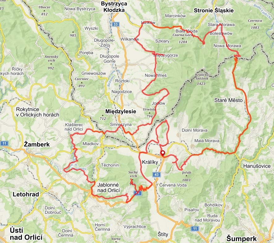 TRASA A ZAJÍMAVOSTI: Králíky, Červená Voda, Štíty, Heřmanice, Bystřec, v.n. Pastviny, Klášterec n. Orlicí, Zemská brána, Bartošovice, Miedzylesie, Jodlów, Miedzygorze, sedlo Puchacza, Stronie Slaskie, Ladek Zdroj, Ladecké sedlo, Žulová, jeskyně Na Pomezí, Ramzovské sedlo, Branná, Hanušovice, Svatá Trojice, Horní Morava