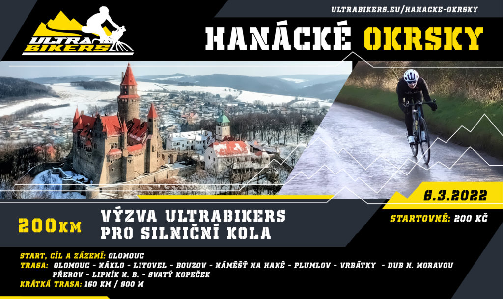 V neděli 6.3.2022 se konala první Výzva Poháru UltraBikes s hromadným startem s názvem „Hanácké okrsky“. Na start dorazilo 13 UltraBikerů, pro které byly připraveny tři varianty trasy 195 km, 155km a 124km, s možností přechodu na kratší trasu i v průběhu závodu. Přestože předpověď počasí slibovala polojasno, sluníčko se nám příliš neukázalo a kromě teplot okolo 2°C závod znepříjemňoval také sychravý vítr, který pocitově foukal skoro stále v protisměru. Navzdory tvrdým podmínkám a časnému terminu však byly k vidění skvělé výkony. Na hlavní trase byl nejrychlejší PETR JANŮ z Brna (čas 7:15), na krátké trase zvítězil JAN MIKOLAJEK ze Zašové (čas 6:35).