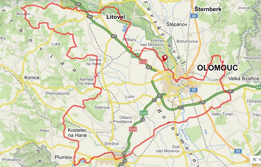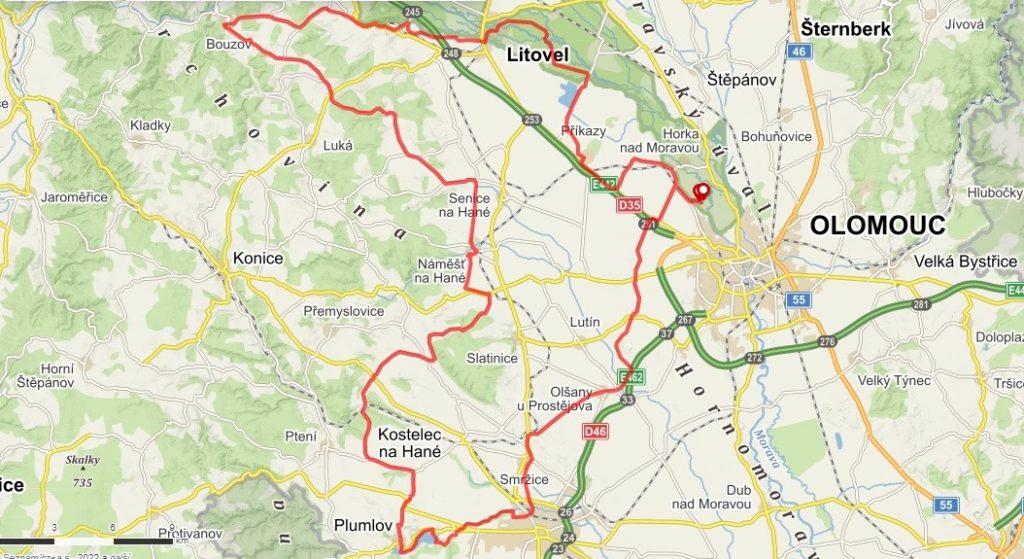 TRASA A ZAJÍMAVOSTI: Olomouc – hanácký skanzen Příkazy – pískovna Náklo – Litovel – Mladeč – arboretum Bílá Lhota – hrad Bouzov – Javoříčko – zámek v Náměšti na Hané – Černá věž v Drahanovicích – zámek Čechy pod Kosířem – zámek a přehrada Plumlov – cyklostezka podél Hloučely – Prostějov – Olšany – Olomouc