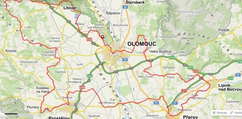 TRASA A ZAJÍMAVOSTI: Olomouc – hanácký skanzen Příkazy – pískovna Náklo – Litovel – Mladeč – arboretum Bílá Lhota – hrad Bouzov – Javoříčko – zámek v Náměšti na Hané – Černá věž v Drahanovicích – zámek Čechy pod Kosířem – Bělkovský mlýn – zámek a přehrada Plumlov – cyklostezka podél Hloučely – Prostějov – Velký Týnec – Velká Bystřice – Svatý Kopeček – Olomouc