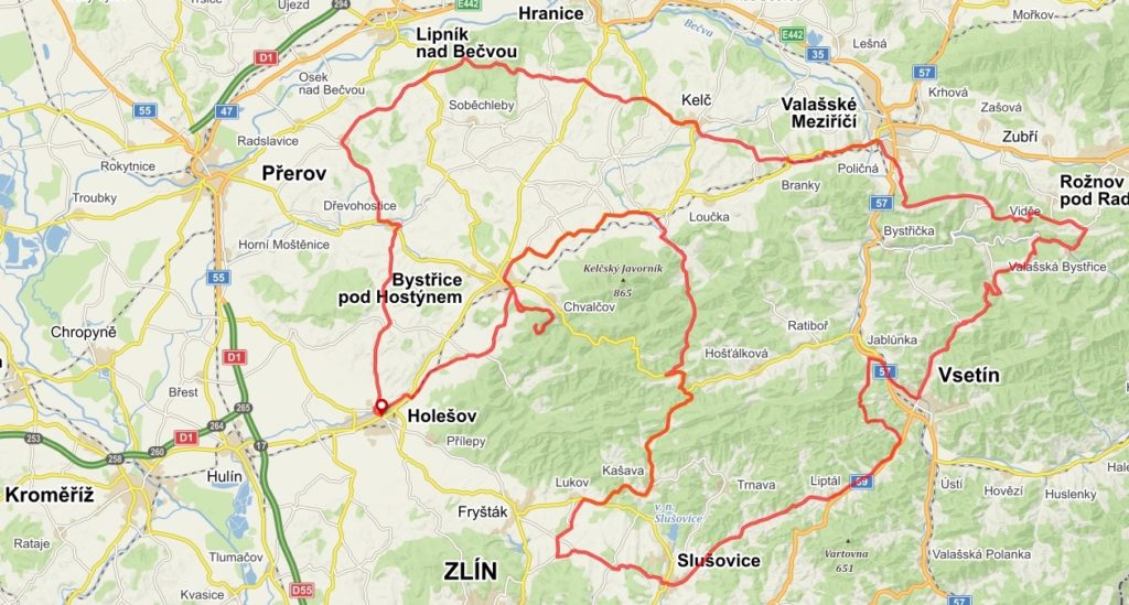 TRASA A ZAJÍMAVOSTI: zámek Holešov, Slavkov p.H., bazilika na Sv. Hostýně, chata Tesák, Troják, rozhledna Maruška, Hošťálková, Držková, Liptál, Vsetín, Dušná, v.n. Bystřička, Velká Lhota, Videčské paseky, Valašské Meziříčí, lázně Teplice nad Bečvou, Hranice na Moravě (centrum, železniční viadukty), Boškov, Slavkovské radary, Lipník n. Bečvou, hrad Helfštýn, Dřevohostice, Kroměříž, Záhlinické rybníky, Hulín, Rýmice