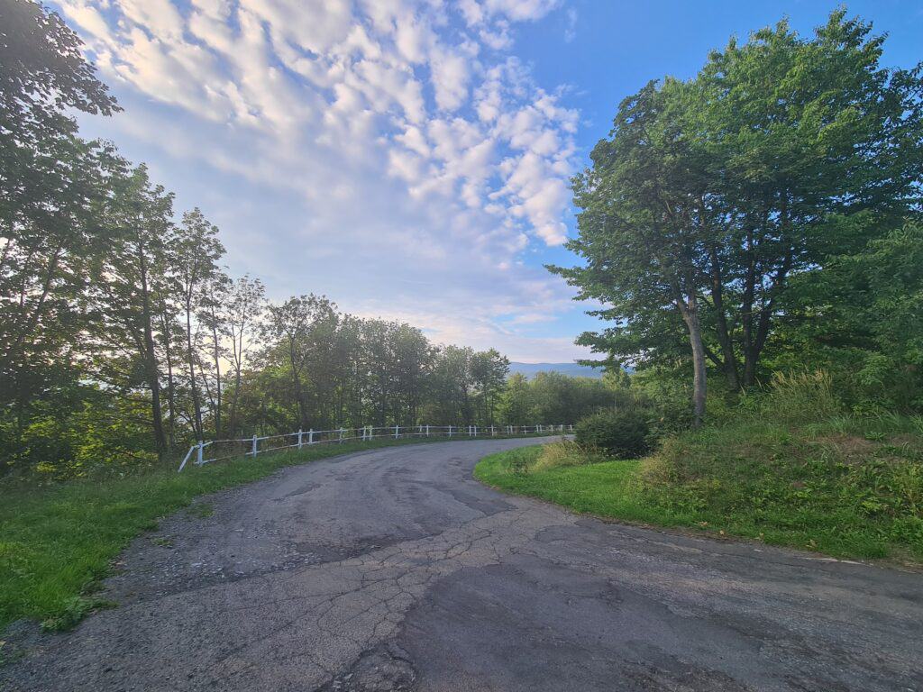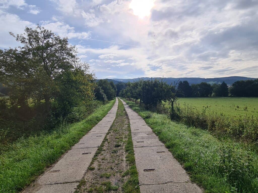 K osadě Prameny vede rozbitá asfaltka s poházenými kameny, při mírném stoupání by ale neměla být přehnaně otravná a budete z ní mít pěkný výhled na Králický Sněžník. Mnohem nepříjemnější bude cca 500m sjezd na lesní cestu vedoucí do Velkých Losin, pohodlnější volbou bude vzít to po okraji louky.