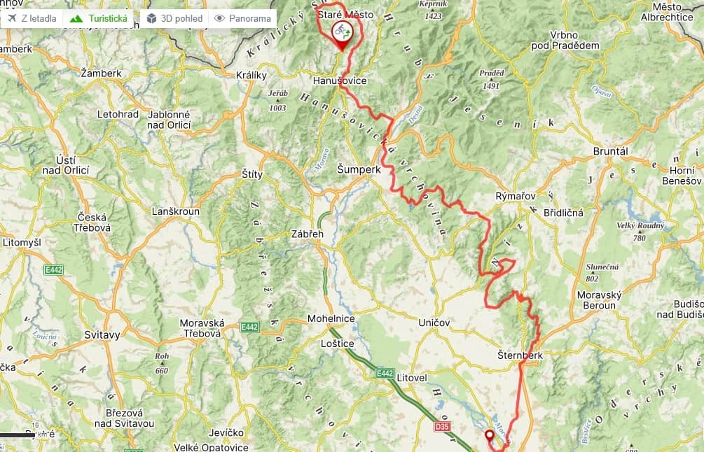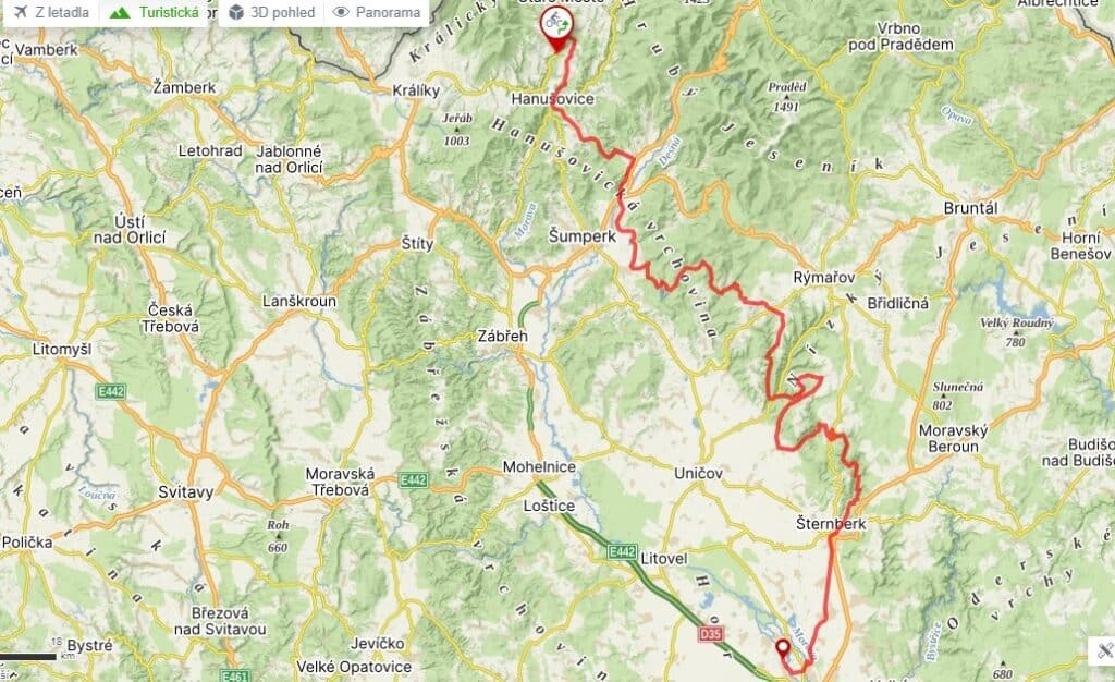 Zatímco údolím Sitky určitě rychle proletíte, v trojici serpentin nad Horním žlebem bude zase potřeba jít párkrát ze sedla. Bude to ale štědře odměněná dřina, protože v polovině silnice do Dalova odbočíte na další klenot Sovinecko – neznačenou uhlazenou šotolinovou vrstevničku pod horním okrajem srázu. Výhledů nebude moc, ale potěšení z jízdy obrovské. Do města pak Šternberk sjedete ve velkém stylu – nejprve po slavné silnici Ecce Homo proslavené automobilovými závody do vrchu a poté po kostkách okolo místního hradu.