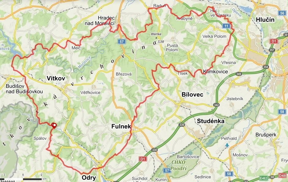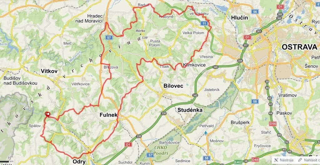 TRASA A ZAJÍMAVOSTI: Spálov – Ludéřov – Odry – Fulnek – větrný mlýn Bílovec (FP1; 33.km) – Výškovice – Bítov – Klimkovice – Porubský balvan – Plesná – dělostřelecké sruby Padařov (FP2; 73.km) – Raduň – rozhledna Šance – Hradec n. Moravicí – Březová – Kamenky