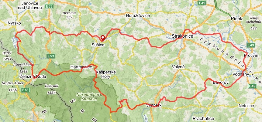 TRASA A ZAJÍMAVOSTI: Sušice – Rabí – Frymburk – Kraselov – Strakonice – vodní tvrz Kestřany – Protivín – Vodňany – Bavorov – Vlachovo Březí – Vimperk – Churáňov – Horská Kvilda – Rejštejn – Hartmanice – Železná Ruda – Hamry – v.n. Nýrsko – Čachrov – Velhartice – Hrádek