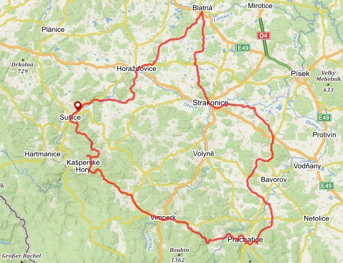 TRASA A ZAJÍMAVOSTI: Sušice – Rabí – Horažďovice – zámek Blatná – Třebohostice – Strakonice – Čepřovice – Dub – Strunkovice n. Blanicí – Prachatice – Vimperk – Stachy – hrad Kašperk