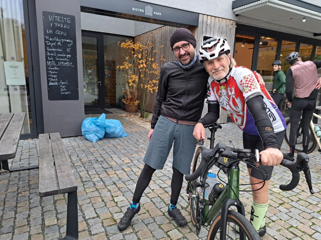 Také za pelotonem se utvořilo poměrně početné grupeto, které si užilo několik desítek společných kilometrů. Na fotce aktuální lídři krátké trasy Jarda Čermák a Olda Blecha …