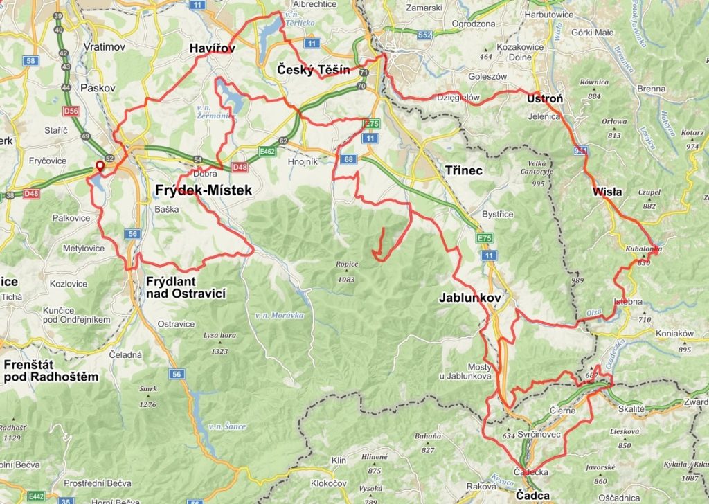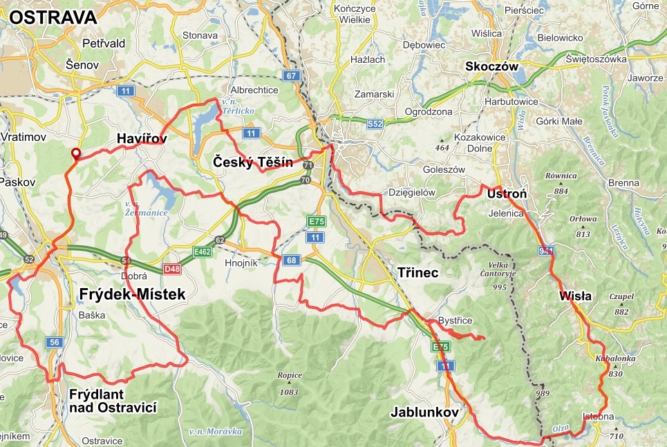 TRASA A ZAJÍMAVOSTI: Olešná, Metylovice, Pražmo, Nošovice, v.n. Žermanice, Soběšovice, Třanovice, dřevěný kostel v Gutech, Javorový vrch, Bocanovice, Mosty u Jabl., Čadečka, Hrčava, Bukovec, Istebná, Czernianské j., Wisla, Ustroń, Cieszyn, Č. Těšín, v.n. Těrlicko, Havířov, Frýdek-Místek