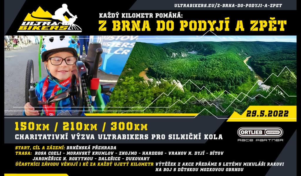Z BRNA DO PODYJÍ A ZPĚT je charitativní silniční závod, ve kterém si UltraBikeři sami volí úroveň své výzvy na pevně daných trasách se startem v Brně, které je zavedou do Podyjí, okolí Vranovské přehrady a Znojma.