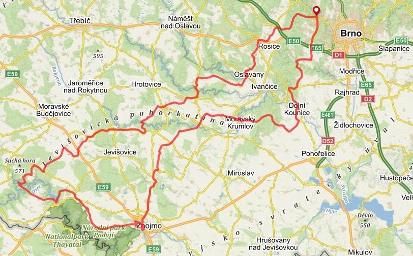 TRASA A HLAVNÍ ZAJÍMAVOSTI: Brno – Oslavany – JE Dukovany – Tavíkovice – zámek Jaroměřice n. Rokytnou – hrad Bítov – zámek a přehrada Vranov n. Dyjí – kostel sv. Antonína Pad. na Hradišti – Znojmo – Únanov – Moravský Krumlov – klášter Rosa Coeli – Ořechov