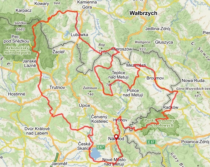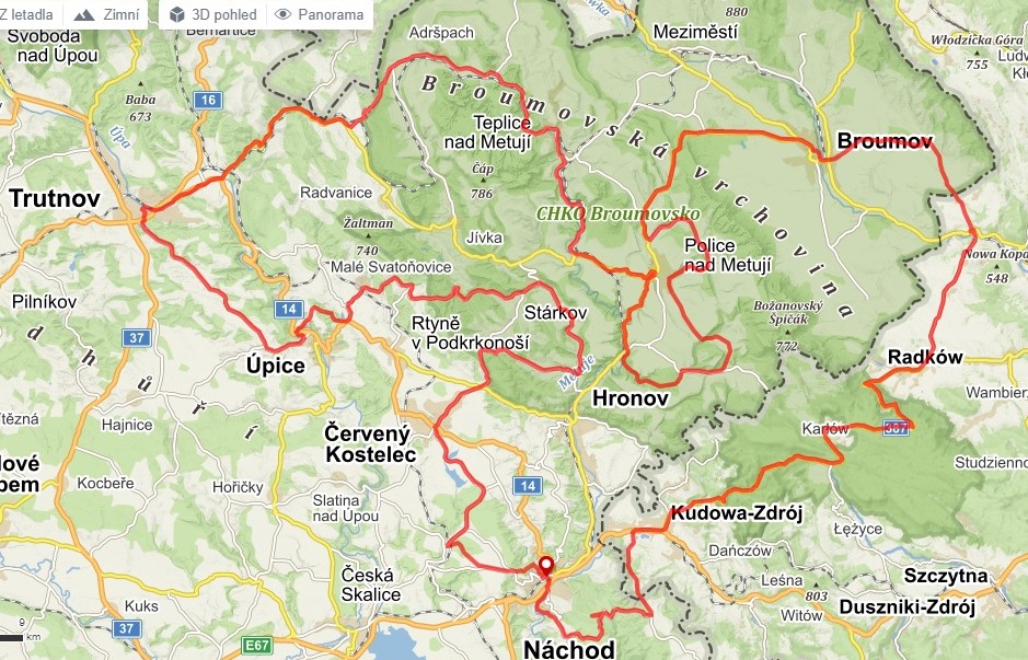 TRASA A ZAJÍMAVOSTI: Náchod – Hronov – Kudowa Zdrój – Karlów – Broumov – Meziměstí – Stárkov – Adršpach – Mieroszów – Lubawka – Pomezní boudy – Horní Maršov – Hrádeček – Hajnice – Hořičky – Slatina n. Úpou – Žernov – Ratibořice – Česká Skalice – v.n. Rozkoš – Nové Město n. Metují – Peklo – Lipí