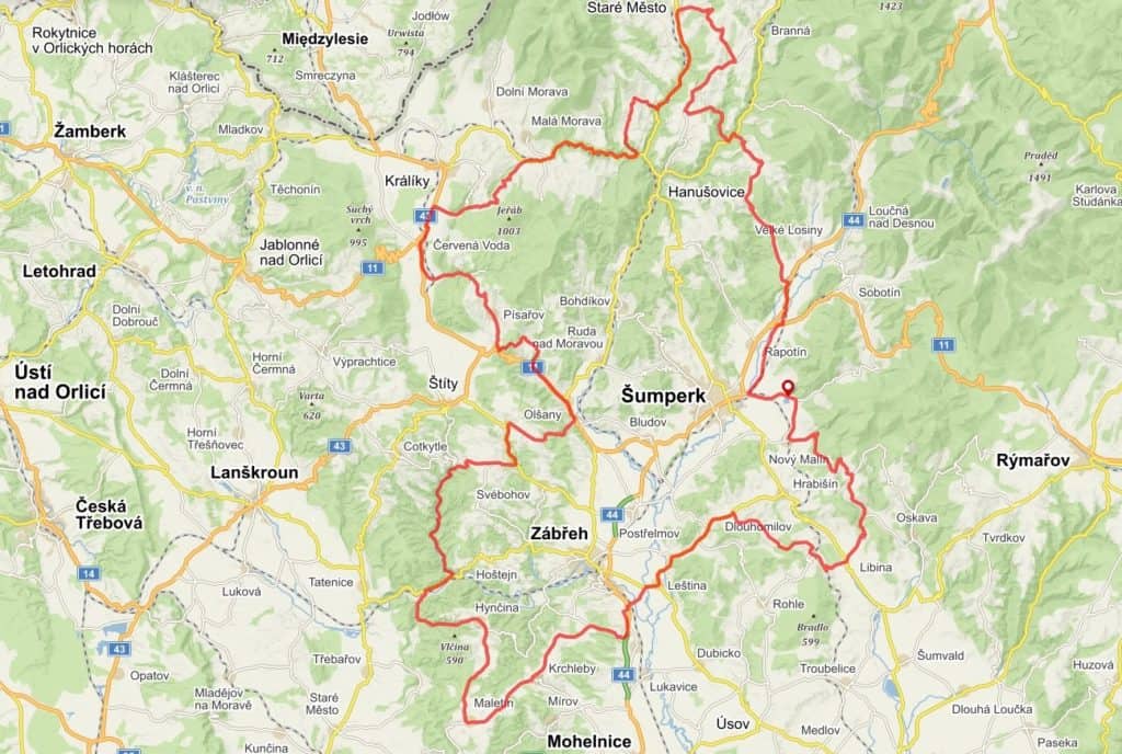 TRASA: Krásné – Velké Losiny – Žárová – Jindřichov – Vikantice – Staré Město – Vysoké Žibřidovice – Zlatý potok – Červená Voda – Písařov – Jakubovice – Zborov – Hynčina – Maletín – Leština – Libina – Mladoňov