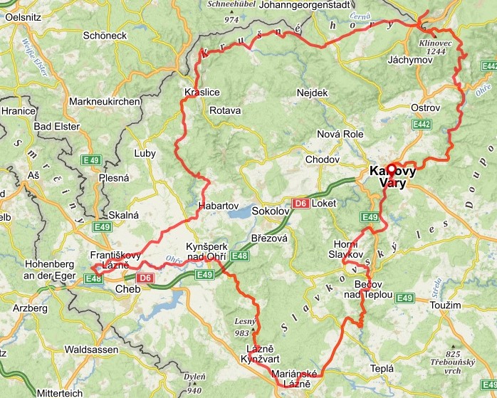 TRASA A ZAJÍMAVOSTI: Karlovy Vary – Horní Slavkov – Bečov n. Teplou – Mariánské Lázně – Lázně Kynžvart – Vysoké sedlo – Kynšperk n. Ohří – Františkovy Lázně – Milhostov – Krajková – Kraslice – rozhledna Bleiberg – Rájecké údolí – Rolava – Boží Dar – Fichtelberg – Klínovec – krytý most v Radošově – býv. lázně Kyselka