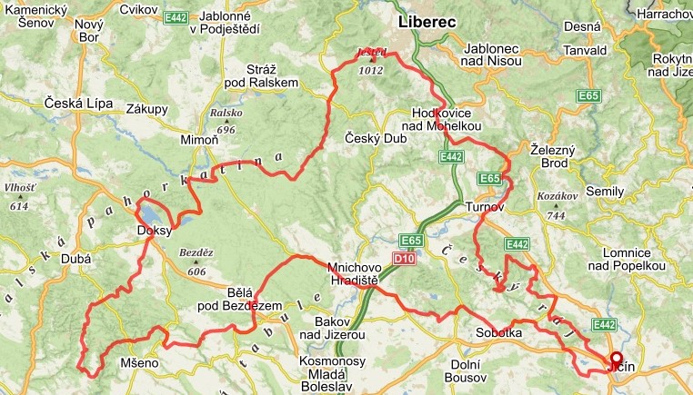 TRASA A ZAJÍMAVOSTI: Jičín – Prachov – Troskovice – Hrubá Skála – Čertoryje – Věžický rybník – Pekařova brána – Kacanovy – Turnov – Malá Skála – zřícenina Vranov – Frýdštejn – Hodkovice n. Mohelkou – Ještěd – Osečná – Ralsko – letiště Hradčany – Máchovo jezero – Doksy – Ždírec – hrad Kokořín – Bělá p. Bezdězem – Klášter – Mnichovo Hradiště – rozhledna Čížovka – hrad Kost – Vesec u Sobotky – Sobotka