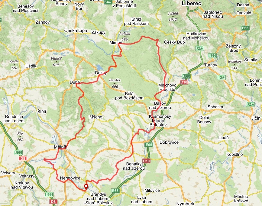 TRASA A ZAJÍMAVOSTI: Kostelec n. Labem – Bezno – Mladá Boleslav – Radouč – Bakov nad Jizerou – Klášter Hradiště – Cetenov – Ralsko – Mimoň – letiště Hradčany – Dubá – hrad Kokořín – Mělník – starý jez Obříství – Neratovice