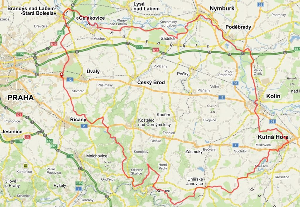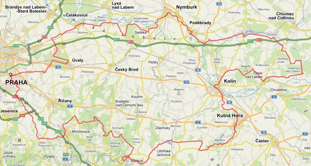 TRASA A ZAJÍMAVOSTI: v.n. Hostivař – Průhonice – Dobřejovice – Velké Popovice – Mnichovice – klášter Sázava – zřícenina Talmberk – Vavřinecký rybník – Roztež – Malešov – Kutná Hora – kamenný kruh u Šipší – Nebovidy – Kladruby n. L. – Poděbrady – Nymburk – Hrabalova hájenka Kersko – Přerov n. Labem – Čelákovice – Úvaly