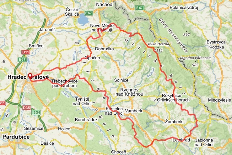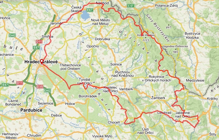 TRASA A ZAJÍMAVOSTI: Hradec Králové – Librantice – Jílovice – Bohuslavice – Nové Město n. Met. – Rokole – Sněžné – Deštné v Orl.h. – Luisino údolí – Říčky v Orl.h. – Rokytnice v O.h. – Klášterec n. Orl. – v.n. Pastviny – Letohrad – Žampach – Skrovnice – Kostelec n. Orl. – Častolovice – Bolehošť – Třebechovice p. Orebem