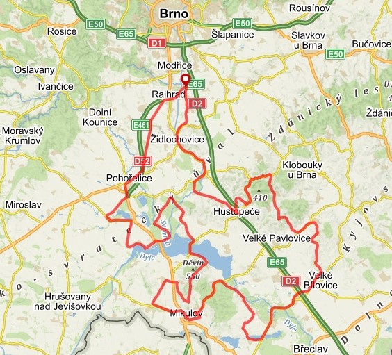 TRASA A ZAJÍMAVOSTI: Rajhrad – Pohořelice – Vlasatice – Pasohlávky – Vranovice – Pavlov – Mikulov – Bulhary – Hlohovec – Lednice – Podivín – Velké Bílovice – Vrbice – Diváky – Hustopeče – Židlochovice