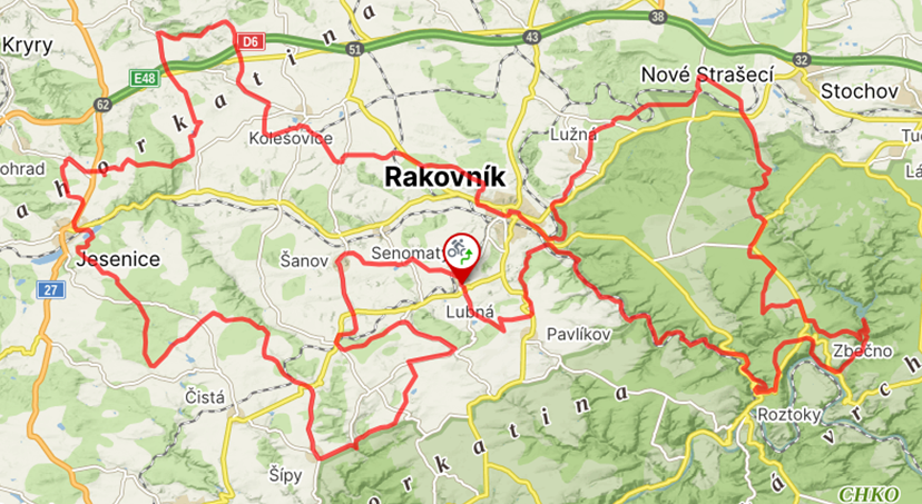 TRASA A ZAJÍMAVOSTI: Šanov – Petrovice – Malinová – Krakovec – Velká Chmelištná – letohrádek Plaveč – rybníky Fikač – lom Bedlno – Lovič – Kolešovice – Rakovník – Lužná – Ruda – v.n. Klíčava – Zbečno – Křivoklát – Pustověty – Senecká hora