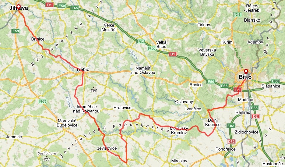 TRASA A HLAVNÍ ZAJÍMAVOSTI: Jihlava – Brtnice – Třebíč – Jaroměřice n. Rokytnou – Jevišovice – Tavíkovice – Dukovany – Moravský Krumlov – Rossa Coeli – Brno