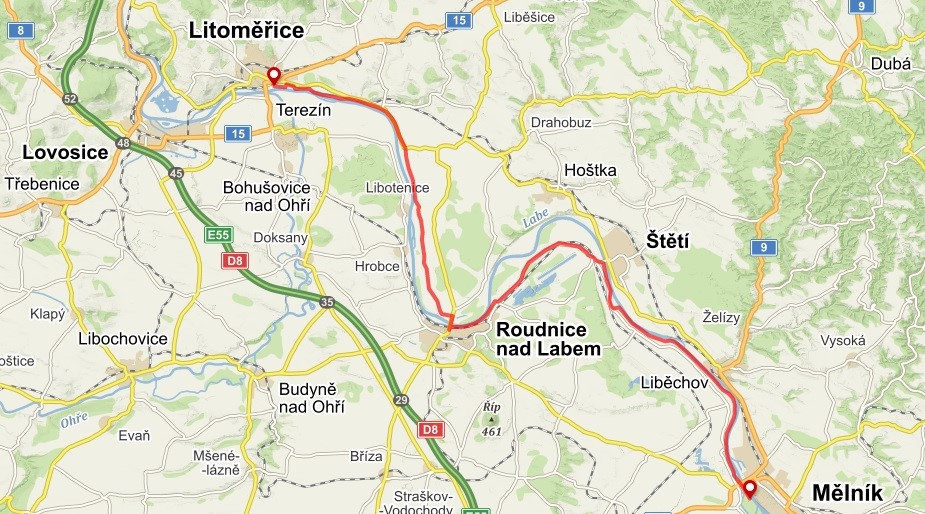 POPIS TRASY: Navržená trať je naprostá rovina, celkem hladký asfalt, hlavně cyklostezky, nebo silnice nižších tříd. Trať je víceméně úsek Labe mezi Mělníkem a Litoměřicemi, celkem necelých 90 kilometrů, což dává možnost si někde u trati zřídit základnu a tam mít po ruce vodu, jídlo, věci na převlečení apod. Pokud nás pojede více, určitě si i pomůžeme navzájem taháním tempa.