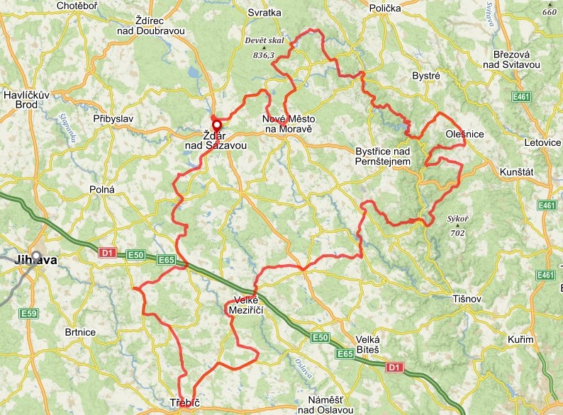 TRASA A ZAJÍMAVOSTI: Žďár n. Sázavou – Bohdalov – Měřín – Kamenice – Třebíč – Budišov – Velké Meziříčí – Křižanov – Meziboří – Mitrov – Rožná – hrad Pernštejn – Hodonín – Olešnice – v.n. Vír – Jimramov – Milovy – Kadov – Nové Město n. M. – Sykovec – Zelená hora