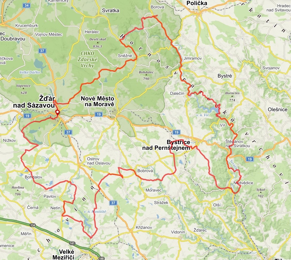 TRASA A ZAJÍMAVOSTI: Žďár n. Sáz. – Bohdalov – Radostín n. Osl. – Vídeň – Radešín – Bystřice n. Pernštejnem – hrad Pernštejn – krytý most v Černvíru – Štěpánov n. Svratkou – v.n. Vír – Jimramov – Lucký vrch – Pustá Rybná – Milovy – Sněžné – Tři Studně – Zelená hora